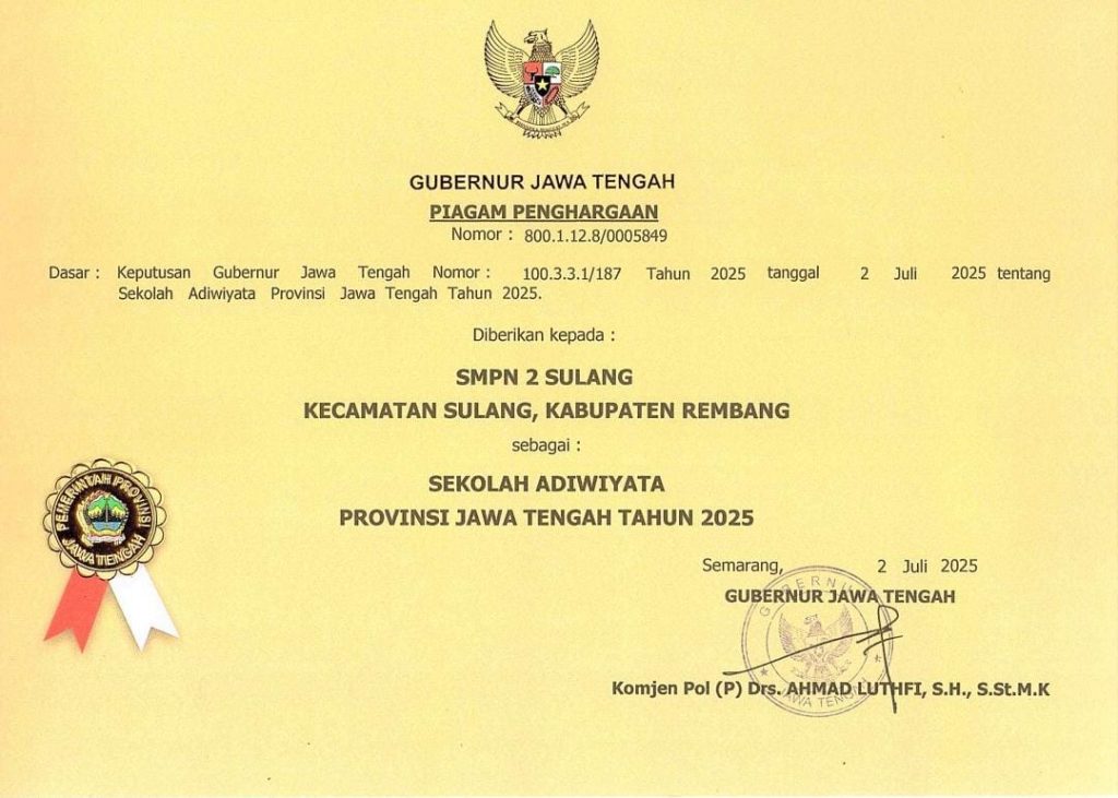 Prestasi membanggakan kembali diraih oleh SMP Negeri 2 Sulang, Kabupaten Rembang. Di bawah kepemimpinan Kepala Sekolah Choirotul Nurul Mustaqimah, S.Pd., M.Pd., sekolah ini berhasil meraih Penghargaan Adiwiyata Tingkat Provinsi Jawa Tengah Tahun 2025. Penghargaan tersebut diberikan sebagai bentuk apresiasi atas komitmen dan konsistensi SMPN 2 Sulang dalam mengembangkan budaya peduli lingkungan secara berkelanjutan di lingkungan […]